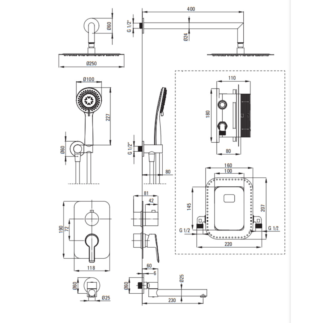 - Tip produs: Baterie dus+corp incastrat+Palarie+Set dus